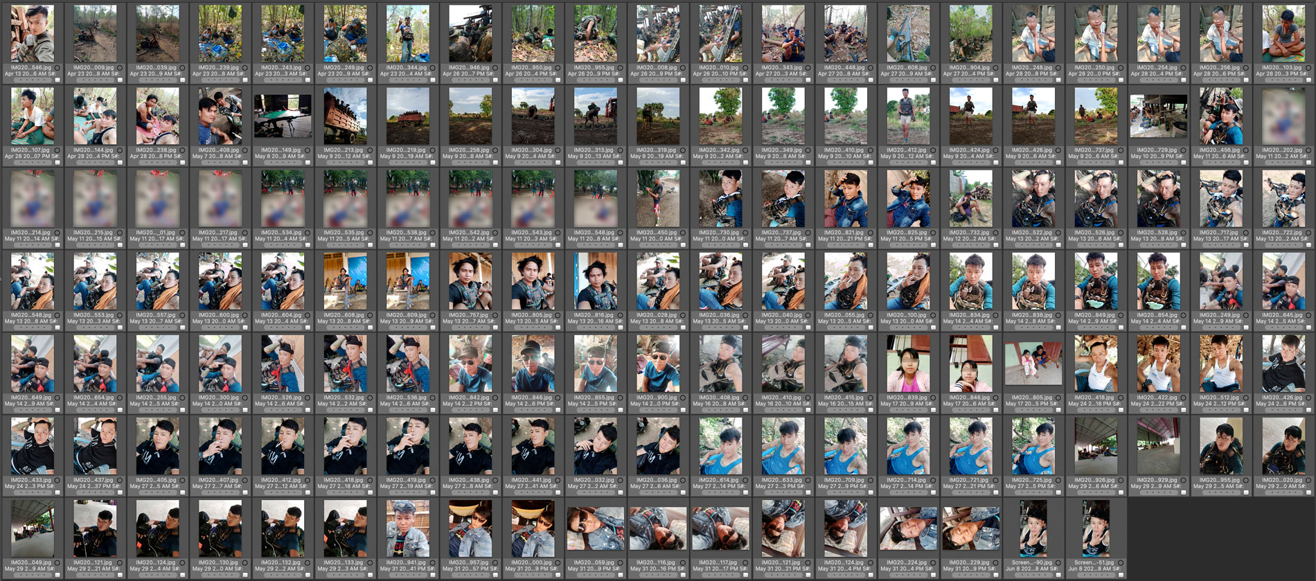ဓာတ်ပုံတွေကို RFA ရုံးချုပ်မှာ လေ့လာချက်အရ ရိုက်ကူးတဲ့တယ်လီဖုန်းဟာ တရုတ်နိုင်ငံလုပ် OPPO အမျိုးအစားဖြစ်တာ တွေ့ရပါတယ်။ လူငယ်တစ်ယောက်ကို ရင်ဘတ်မှာ ဓားနဲ့ထောက်ပြီး စစ်ဆေးနေတဲ့ပုံကို ဧပြီလ ၂၈ ရက်နေ့မှာ ရိုက်ကူးထားတာဖြစ်ပြီး၊ အရပ်သားတွေကို လက်ပြန်ကြိုးတုပ်ပြီးဖမ်းထားတဲ့ ဓာတ်ပုံက မေလ ၁ဝ ရက်နေ့၊ လူငါးယောက်ကို သတ်ဖြတ်ထားတဲ့ဓာတ်ပုံက မေလ ၁၁ ရက်နေ့မှာ ရိုက်ကူးထားတာ ဖြစ်ပါတယ်။
