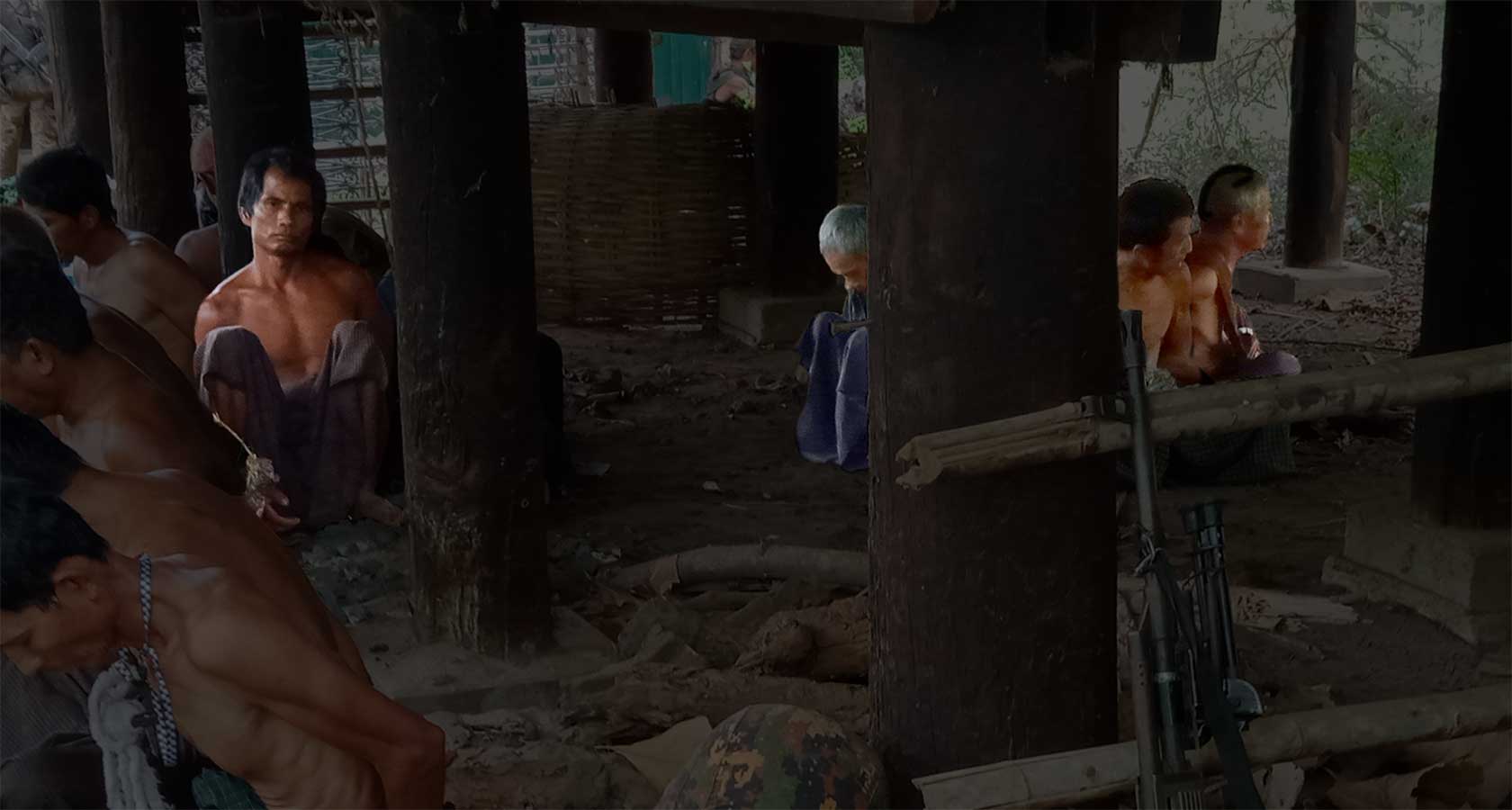 မုန်တိုင်ပင်ဘုန်းကြီးကျောင်းအတွင်း လက်နောက်ပြန်ကြိုးတုပ်ထားသည့် ရွာသားအယောက်သုံးဆယ်ခန့်အား တန်းစီထိုင်ခိုင်းထားသော ဓာတ်ပုံများကို စစ်ကောင်စီတပ်သား ကျကျန်ခဲ့သည့် ဖုန်းမှတစ်ဆင့် RFA က ရရှိခဲ့ပါသည်။ ကာယကံရှင်များ၏ မိသားစုများမှတစ်ဆင့် ရွာသား ၁၅ ယောက်ကို (ပုံတွင်နာမည်များဖြင့် ဖော်ပြထားသည်) မည်သူမည်ဝါဖြစ်ကြောင်း RFA က စုံစမ်းဖော်ထုတ် အတည်ပြုထားပါသည်။