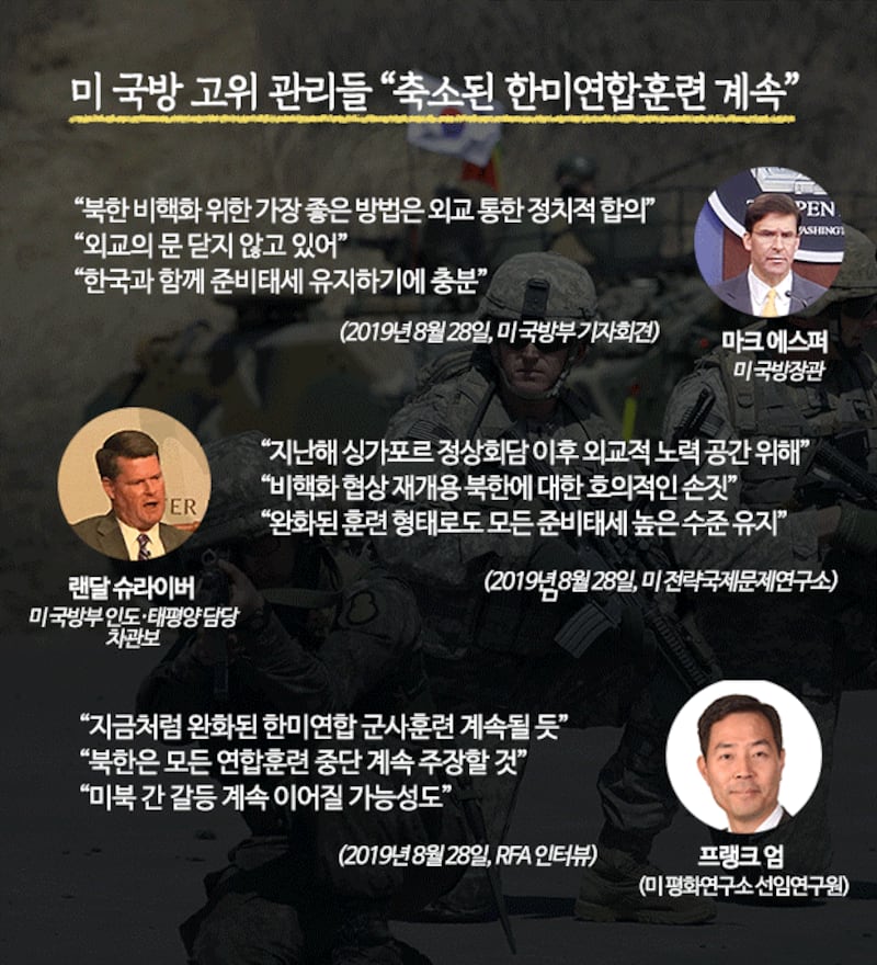버락 오바마 행정부 당시 미 국방장관 선임보좌관을 지낸 프랭크 엄 미 평화연구소 선임연구원은 최근(28일) 자유아시아방송(RFA)에 슈라이버 차관보의 발언에 비추어 볼 때 지금처럼 완화된(modified) 한미연합 군사훈련이 계속될 것으로 해석했습니다.
