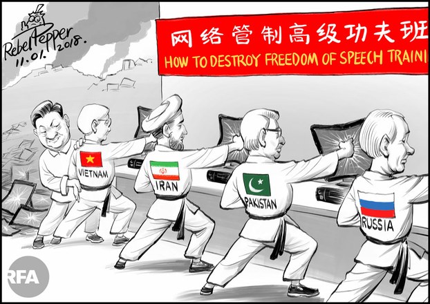 Tranh biếm họa: Lớp học đàn áp tự do báo chí do Trung Quốc đào tào
