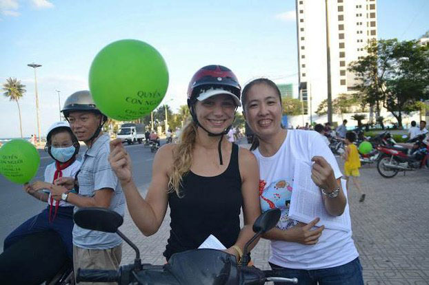 Nguyễn Ngọc Như Quỳnh phát Bản Tuyên Ngôn Quốc tế Nhân quyền và bóng bay ghi dòng chữ ‘Quyền của con người phải được tôn trọng’ ở Nha Trang hôm 21/5/2013.  Photo courtesy of Nguyen Ngoc Nhu Quynh