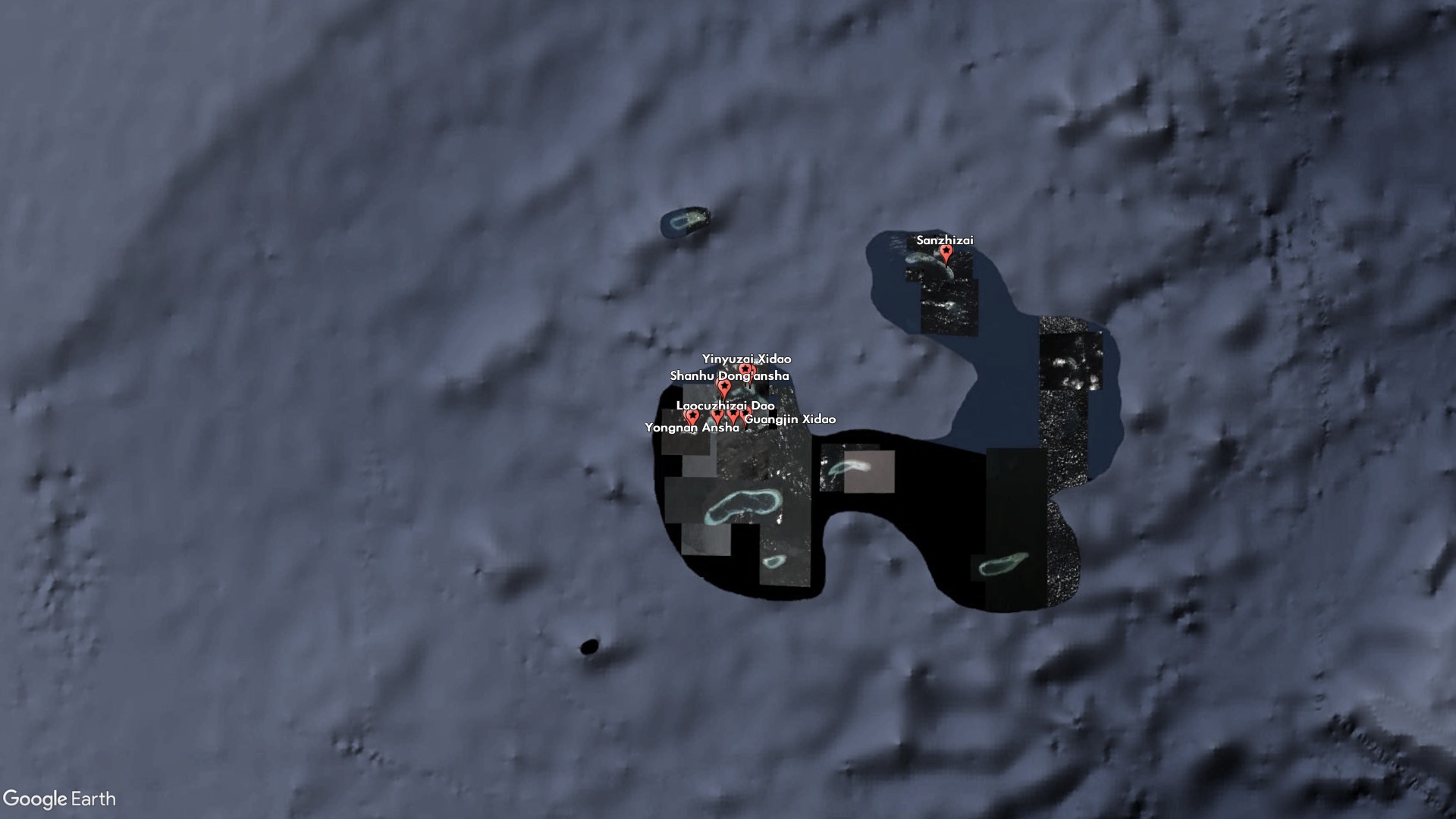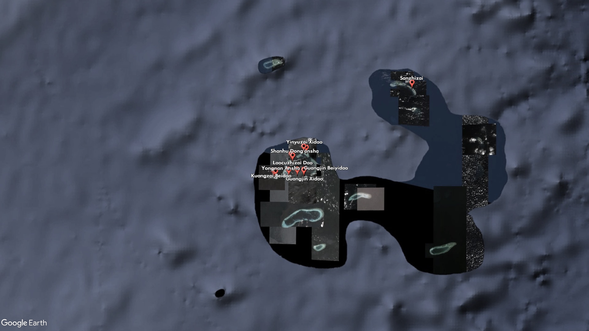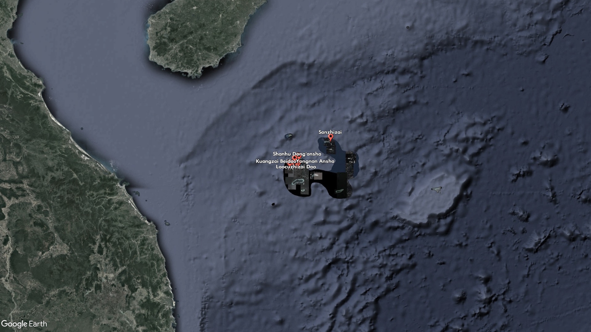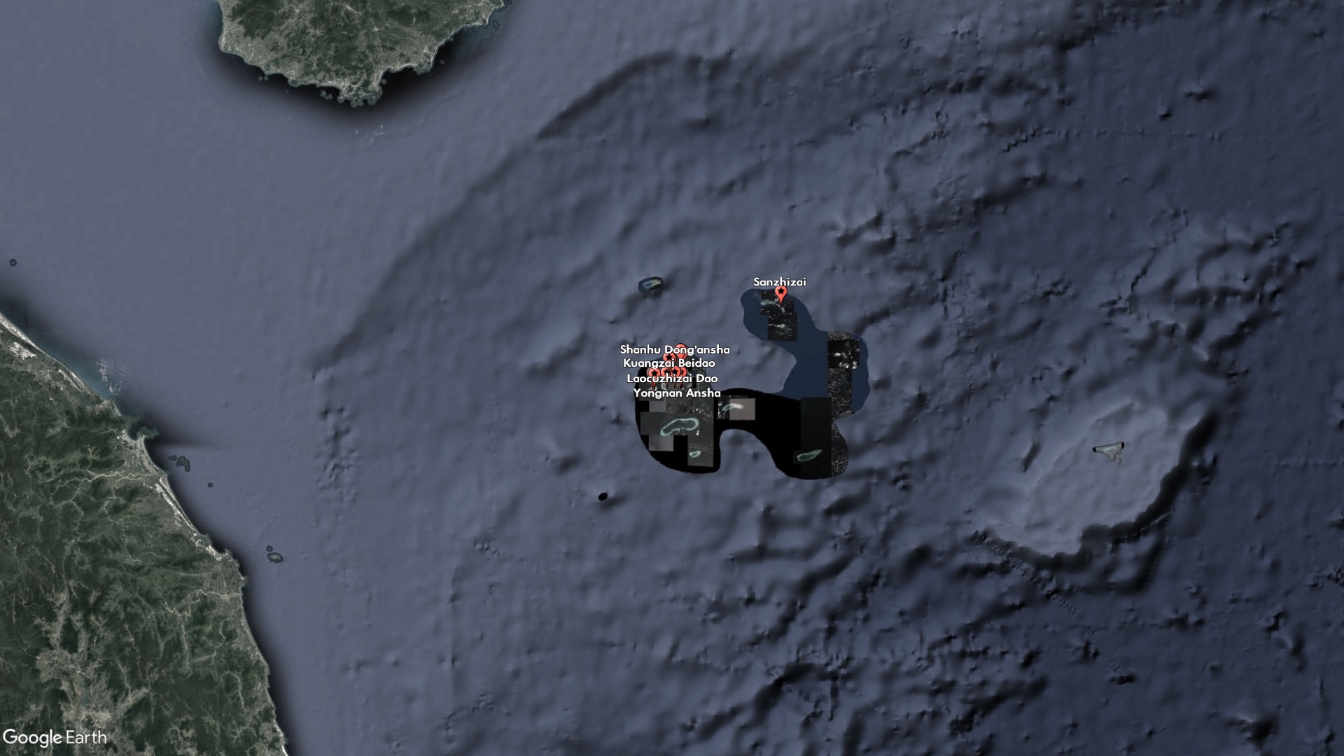 Một trong những thực thể mới, Sanzhizai, là một đê cát mà hình ảnh vệ tinh cho thấy là không có người ở và gần như không nổi lên trên mặt nước bất kỳ lúc nào. Nó nằm giữa Đảo Trung và Đảo Nam, là các đảo cũng không có người ở và được Trung Quốc tuyên bố chủ quyền. Trung Quốc đã chiếm đóng tất cả các thực thể không có người ở quanh đó, bao gồm Đảo Bắc, nơi có tiền đồn quân sự và Đảo Cây, nơi có cảng lớn hơn và căn cứ quân sự.