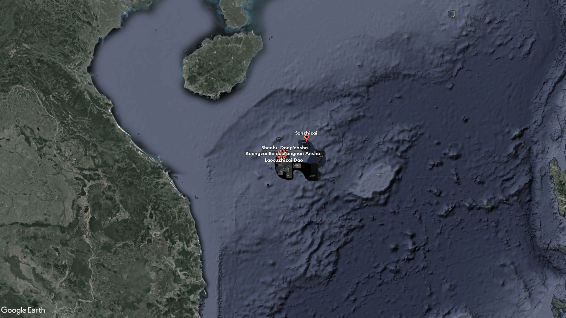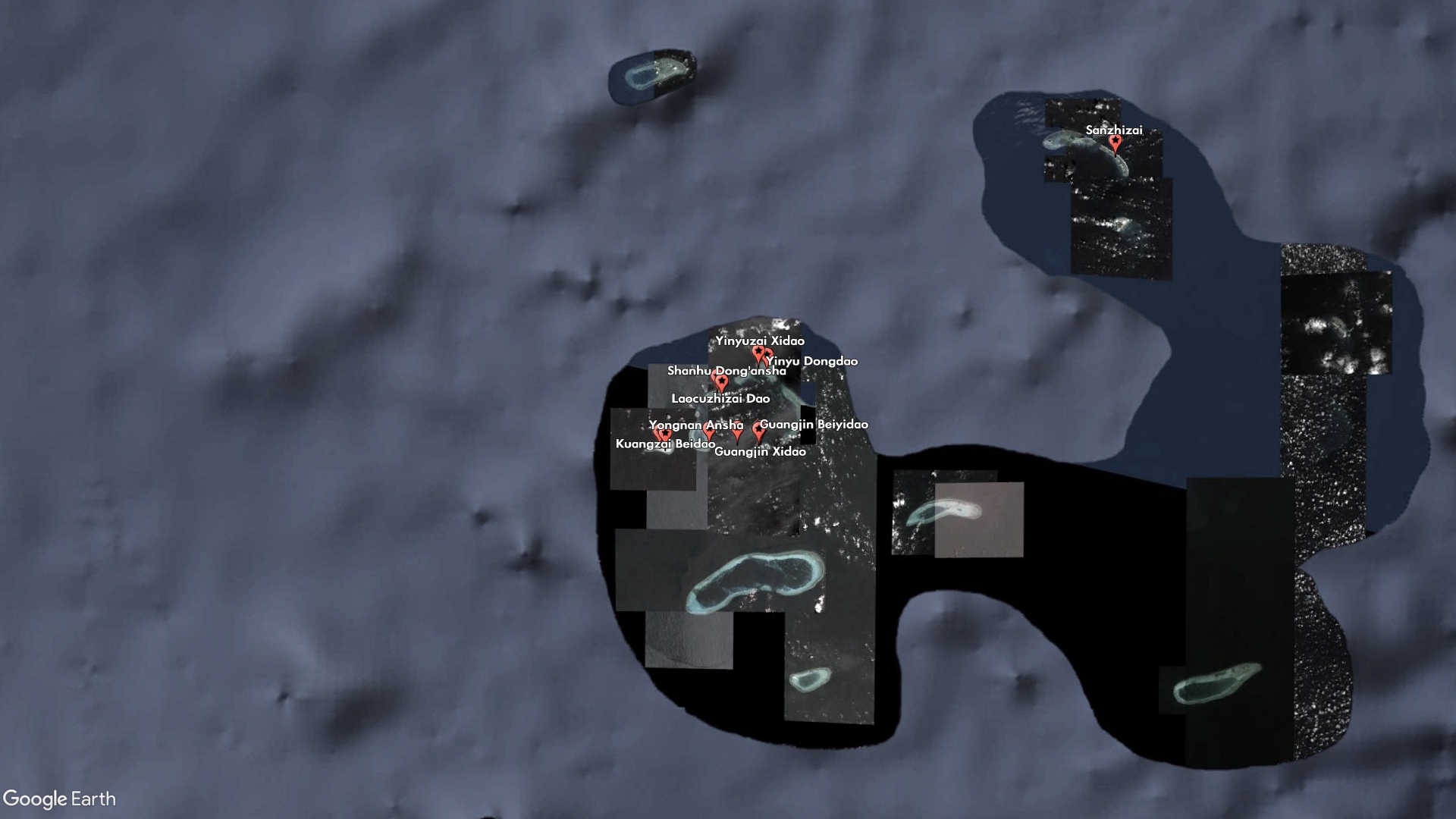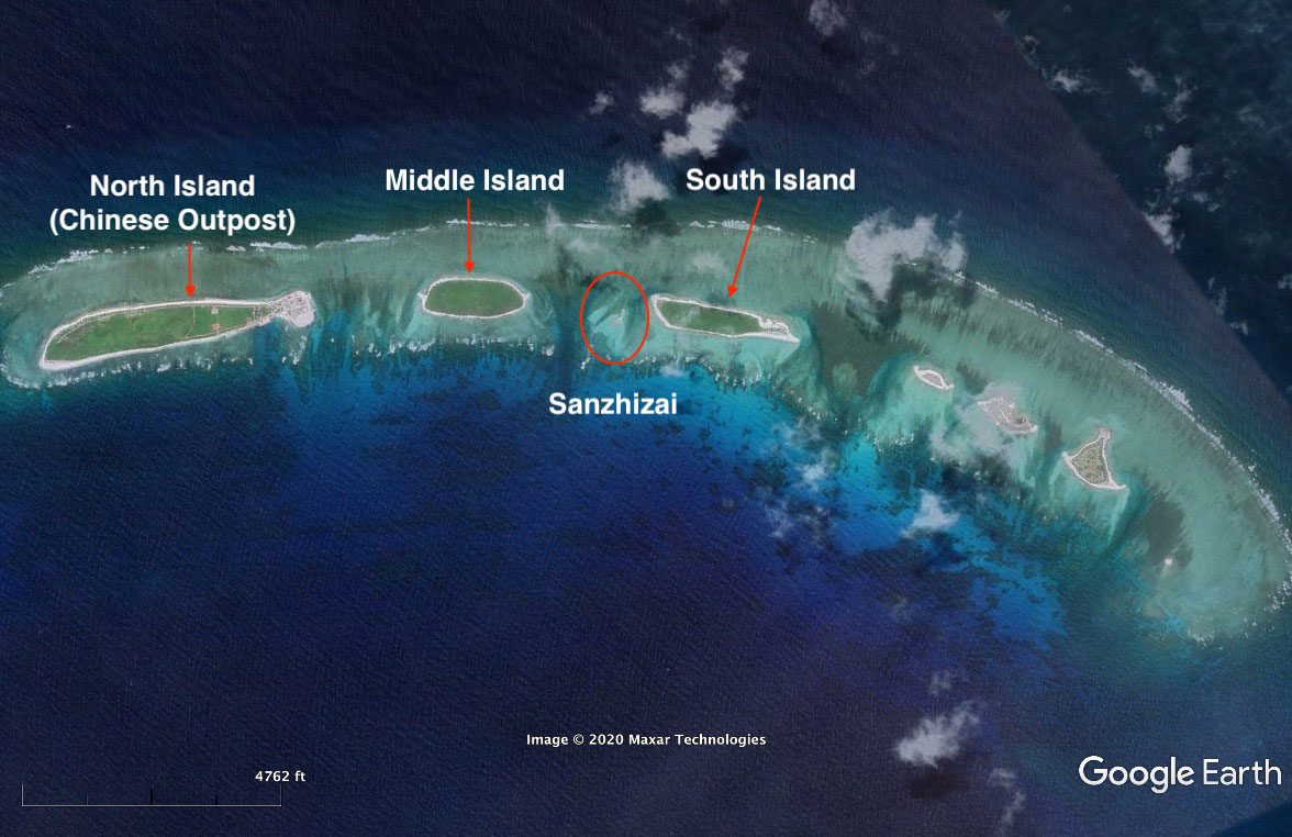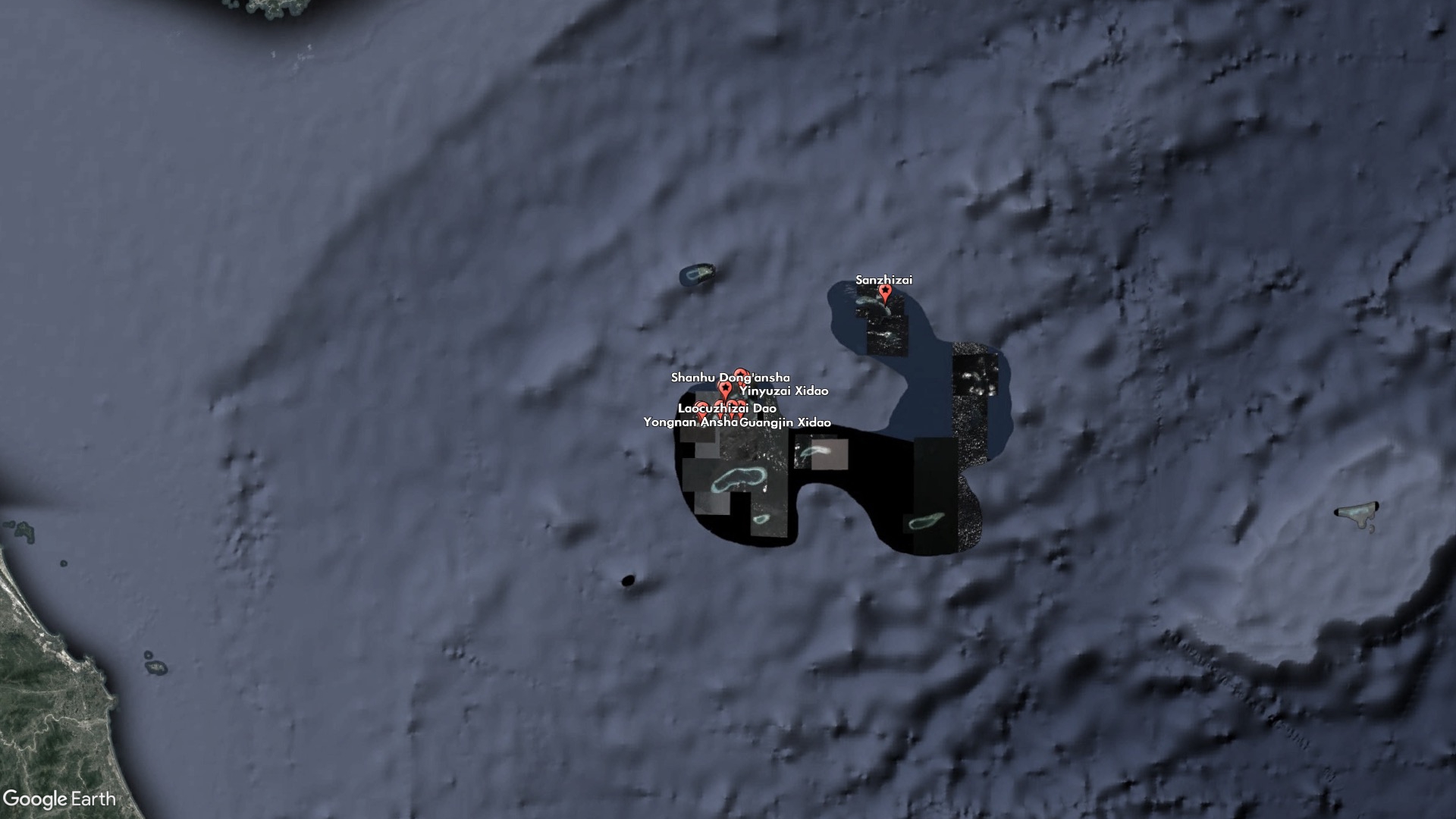 Một trong những thực thể mới, Sanzhizai, là một đê cát mà hình ảnh vệ tinh cho thấy là không có người ở và gần như không nổi lên trên mặt nước bất kỳ lúc nào. Nó nằm giữa Đảo Trung và Đảo Nam, là các đảo cũng không có người ở và được Trung Quốc tuyên bố chủ quyền. Trung Quốc đã chiếm đóng tất cả các thực thể không có người ở quanh đó, bao gồm Đảo Bắc, nơi có tiền đồn quân sự và Đảo Cây, nơi có cảng lớn hơn và căn cứ quân sự.