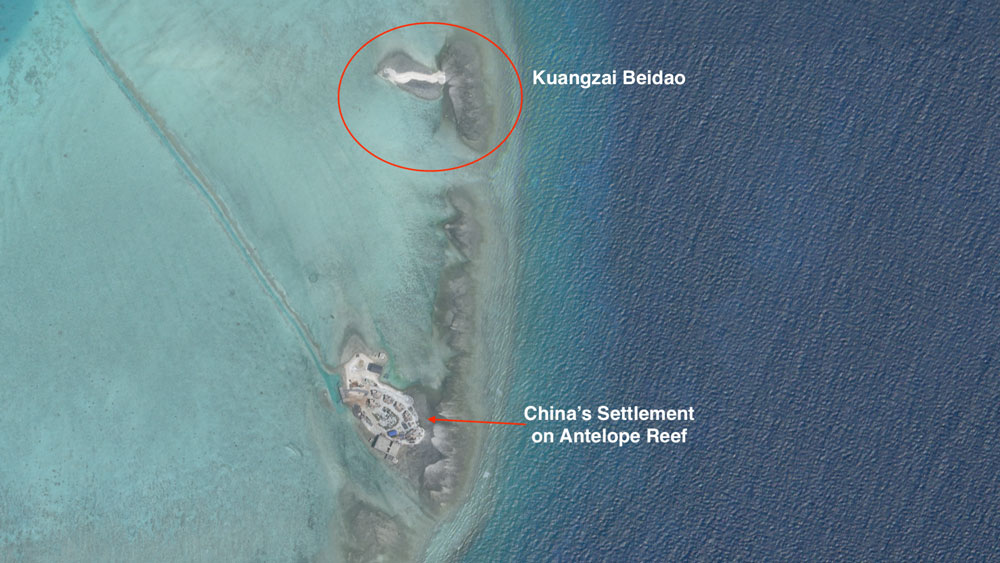 Không có thực thể nào do Trung Quốc đặt tên ở Hoàng Sa đủ tiêu chuẩn theo pháp lý được gọi là đảo. Hai thực thể chìm hoàn toàn dưới mặt nước biển. Số còn lại là các bãi cạn hoặc bãi cát. Kuangzai Beidao - hay còn gọi là Đảo Basket Bắc - là một ví dụ. Thực thể này chỉ là một dải đất có bề rộng ít hơn 1/10 mile từ điểm đầu đến điểm cuối. Nó nằm cạnh một đảo nhỏ tý hon mà Trung Quốc chiếm đóng là Bãi Antelope, nơi có một số các toà nhà được xây trên đó.