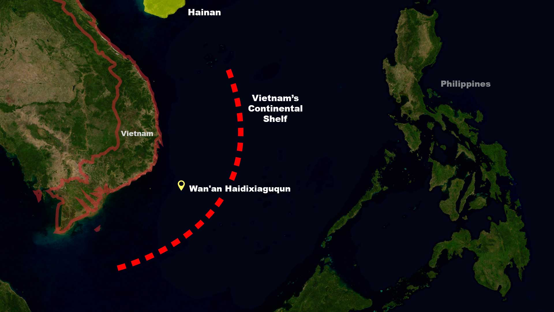 Nhưng một số trong những thực thể mới mà Trung Quốc đòi chủ quyền như Wan'an Haidixiaguqun (Nhóm thung lũng ngầm Vạn An), lại rõ ràng nằm trong vùng 200 hải lý cách bờ biển Việt Nam, nghĩa là nằm hẳn trong vùng thềm lục địa của Việt Nam. Trong khi Trung Quốc khẳng định rằng nước này cũng có thềm lục địa trải rộng ra từ quần đảo Trường Sa và Hoàng Sa bao phủ cả khu vực này, thì lập trường này nếu xét theo mặt pháp lý lại chưa bao giờ được công nhận theo UNCLOS.